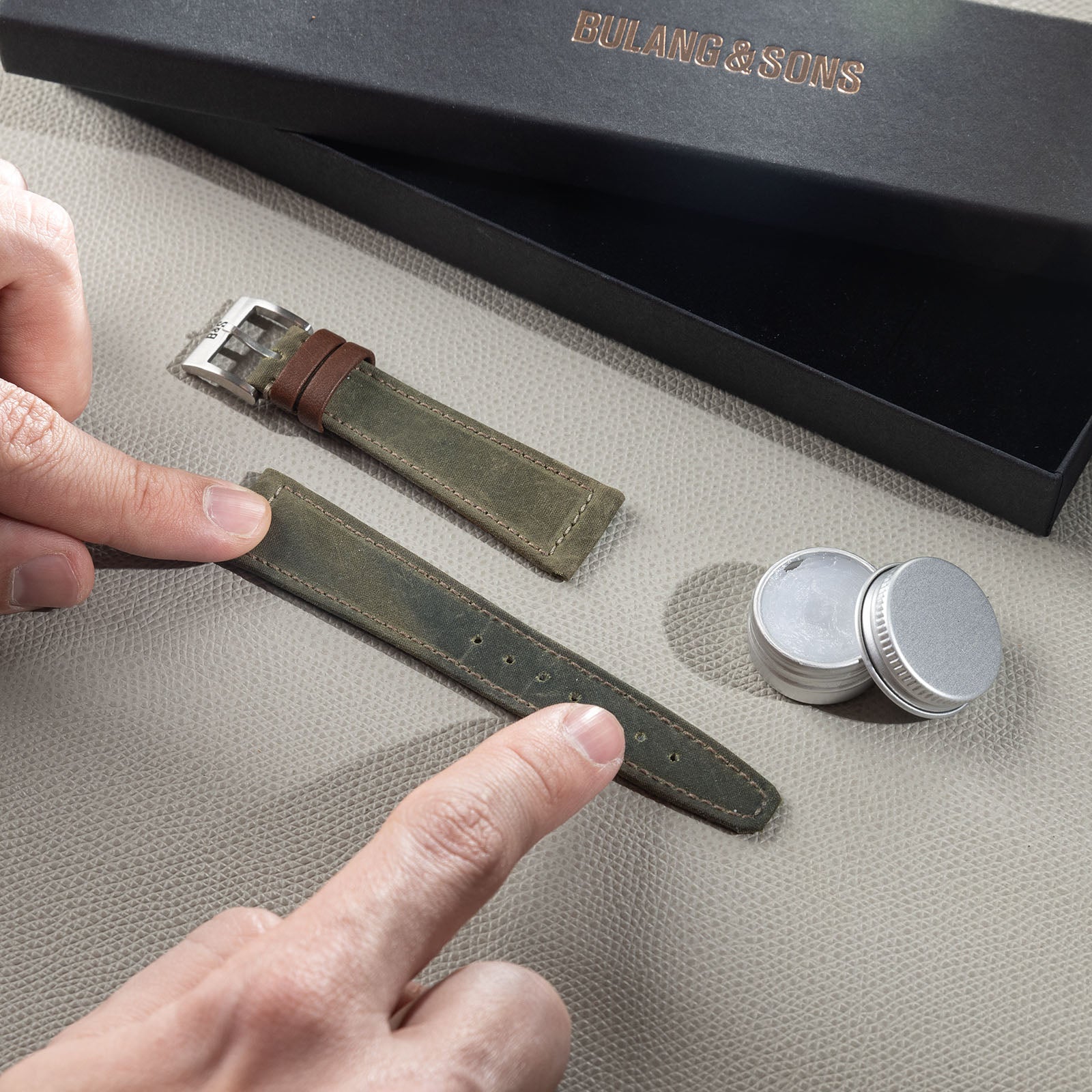 Nos essentiels de montre sont fabriqués à partir des meilleurs matériaux naturels. S'ils sont en cuir, vous pouvez être sûr qu'il n'y a pas de revêtement chimique ni de cire sur le dessus, ce qui les rend très doux et pleins de caractère. Cette qualité naturelle provoque également un vieillissement du matériau au fil du temps. Chaque article développe sa propre patine individuelle, ce que nous aimons particulièrement. Veuillez ne pas traiter le cuir avec de l'huile ou de la cire car cela altère la nature même du produit.